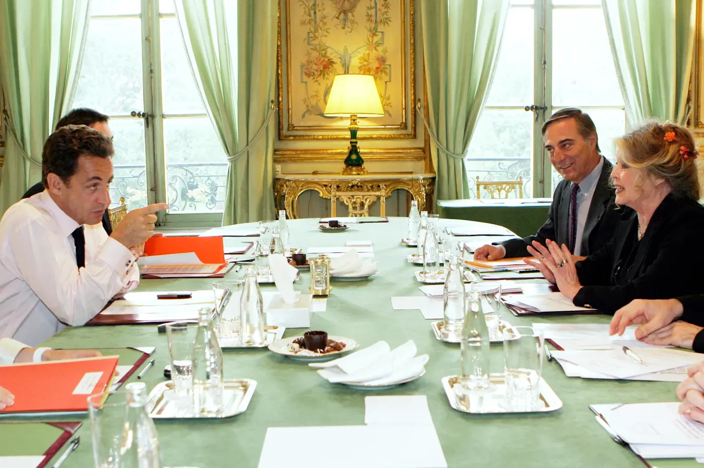 Brigitte Bardot with then-President of France Nicolas Sarkozy at the Elysée Palace in Paris for an environmental policy meeting.