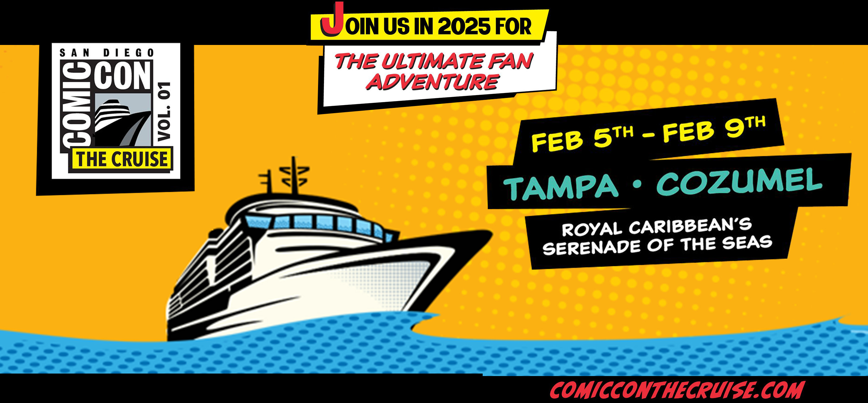 San Diego (July 19, 2023) --- San Diego Comic Convention (parent company of world-renowned Comic- Con in San Diego) announces it has teamed with Entertainment Cruise Productions to produce Comic- Con: The Cruise, a whole new experience that brings the community together and immerses fans in the world of popular arts like never before. This ultimate fan adventure celebrates their passions and is full of surprises, with original, one-of-a-kind entertainment delivered by iconic and beloved Comic-Con stars and creators who step off the stage and dine, party, and interact with the guests throughout the cruise in an environment like no other. A full-ship charter, Comic-Con: The Cruise sails February 5-9, 2025, from Tampa, FL, to Cozumel onboard Royal Caribbean’s Serenade of the Seas.“With a stellar reputation for producing fan events on the ocean, we are excited that EntertainmentCruise Productions has developed Comic-Con: The Cruise to be a truly new kind of adventure,” saidDavid Glanzer, spokesperson for the popular event. “The team at ECP shares our passion fortransformational events and innovative programming and we are excited they are building something soamazing.”“Comic-Con is unrivaled in creating a community that brings people together for experiences you can’tfind anywhere else,” says Greg Laubach, Executive Director of Entertainment Cruise Productions. “It’swhat we love to do, and we have designed Comic-Con: The Cruise to be a one-of-a-kind ultimate fanadventure.”Comic-Con: The Cruise is a place where lifelong memories and new friendships will be made, bringing people together over their shared dedication to comics and popular arts. Fans become part of the story with unprecedented opportunities to interact with actors, creators, authors, and more, and see them in settings and showcases unlike anywhere else. They will rub shoulders with their favorite stars amidst a vibrant community of the most passionate fans across the globe during events and activities including: