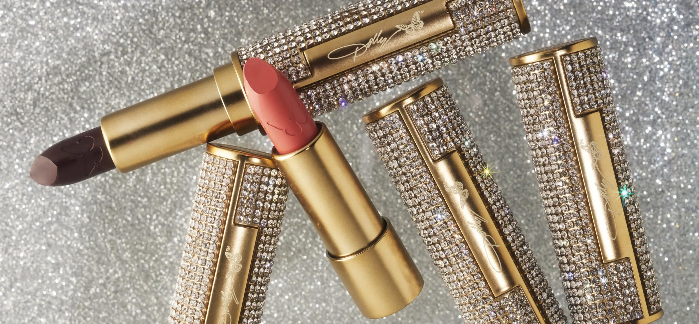 The launch, beginning with Dolly Beauty’s Heaven’s Kiss lipstick collection available in four shades for sale on its website for $20 each, is in distinctly Dolly nomenclature and packaging, encompassed in sparkling rhinestones.