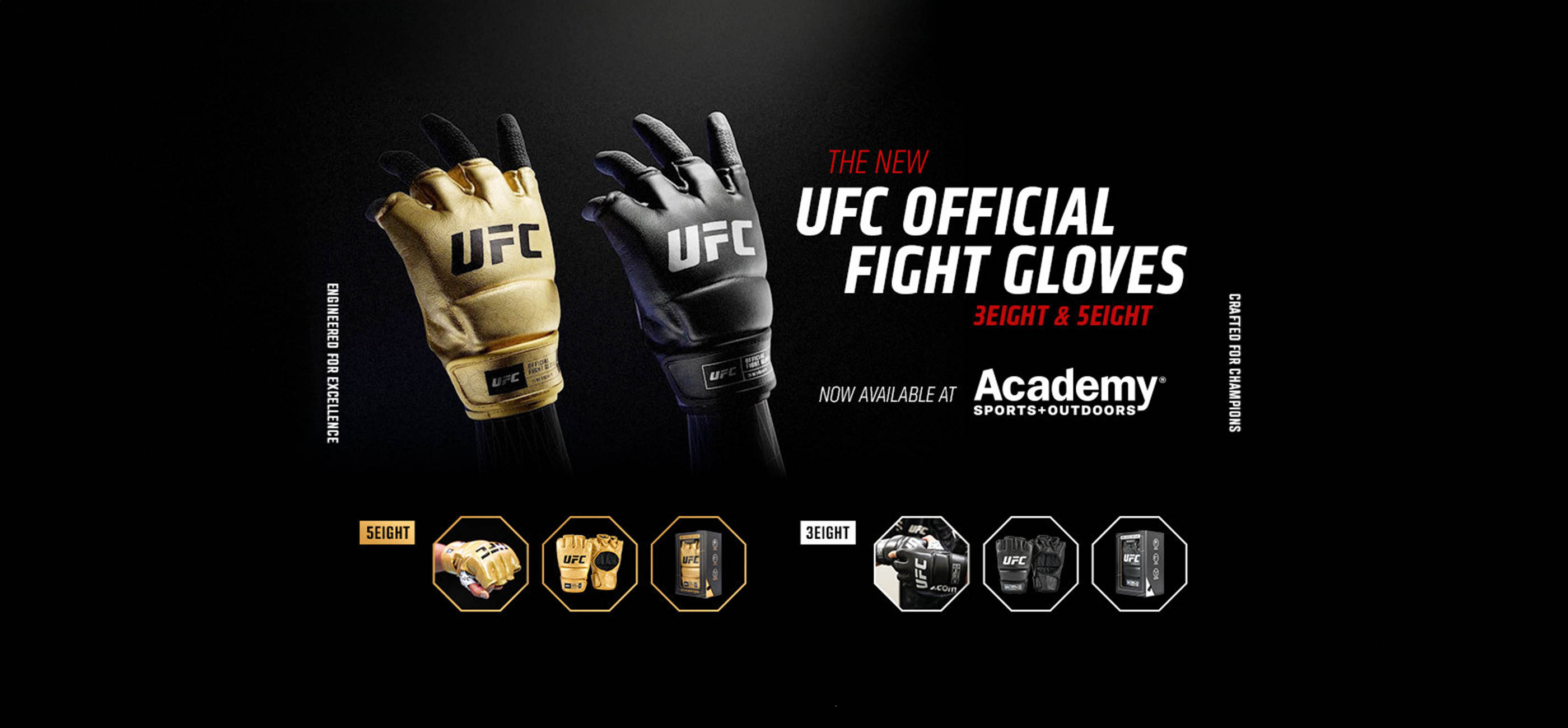 Academy Sports + Outdoors will be the exclusive U.S. in-store retailer for the all-new UFC Official Fight Gloves 3EIGHT and 5EIGHT. These gloves are UFC’s most advanced fight gloves ever, featuring cutting-edge technology to improve protection, fit, and performance. In addition, select Pro Range products, as seen on The Ultimate Fighter (TUF), will also be available in-store at locations across the U.S.