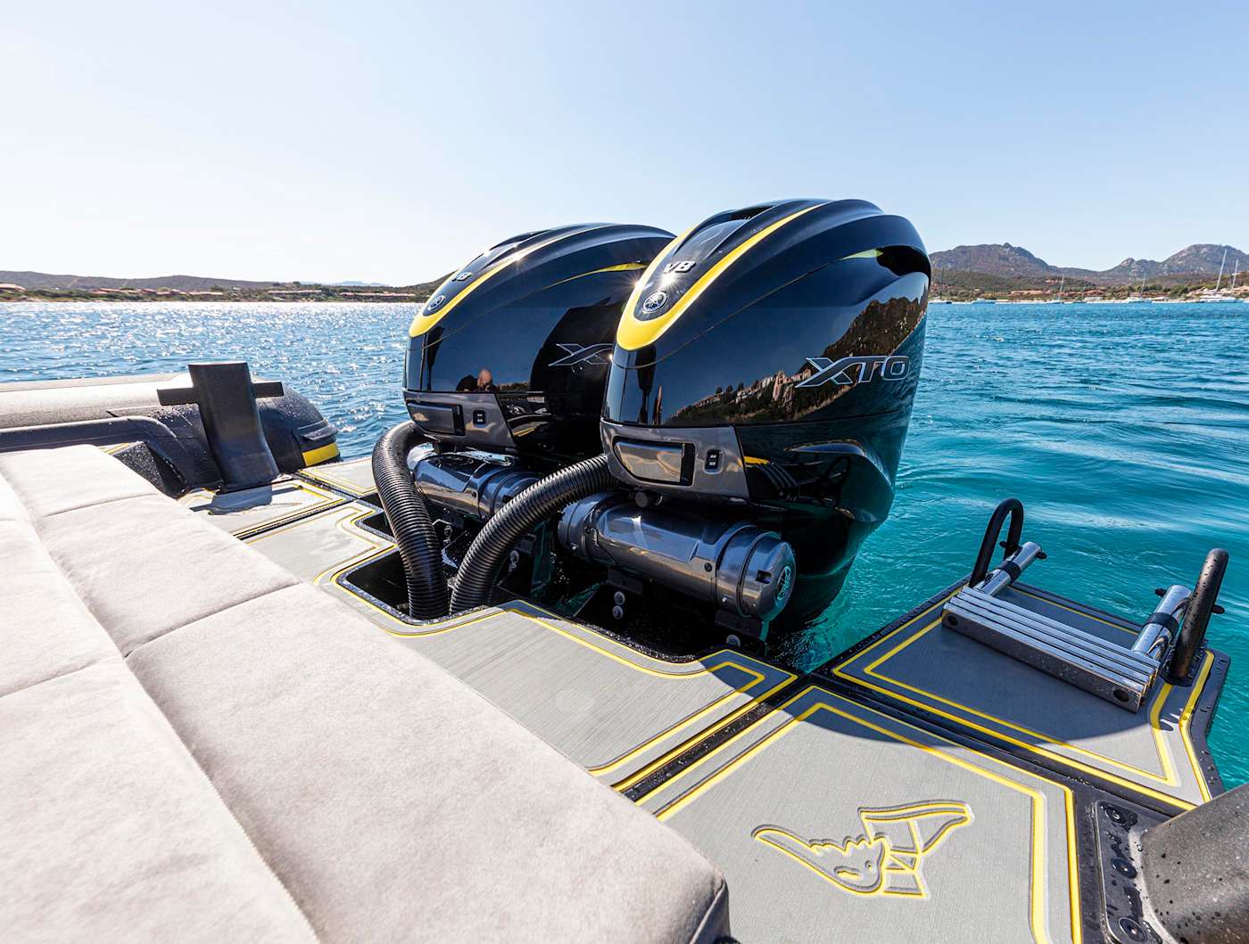 Is powered by two Yamaha 450 XTO outboard engines, featuring Yamaha’s exclusive Helm Master EX wireless control system (a European premiere).