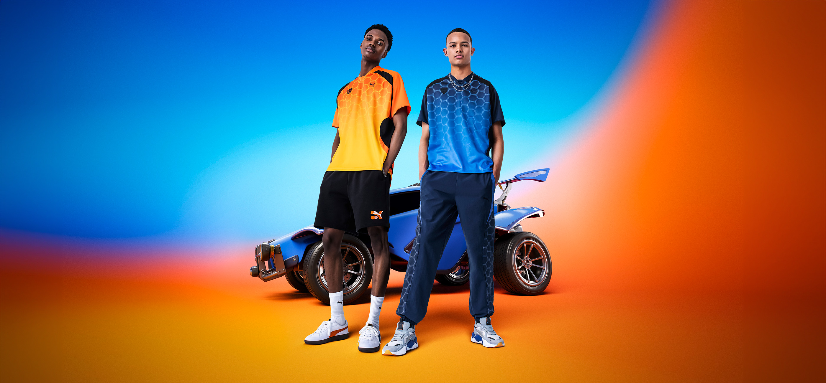 Each piece showcases elevated details, textures and materials. A carbon-fiber motif throughout the apparel nods to the special paint finish in Rocket League, while the footwear takes cues from the game’s iconic cars and teams. With blue and orange colorways, every item lets fans choose their side. Designed for the arena and for the streets, PUMA x “Rocket League” is highlighted by pitch-inspired silhouettes like football jerseys, a Cellerator track jacket and Cellerator track pants. Accessories include the cap featuring PUMA x Rocket League branding on the crown and the backpack featuring an asymmetrical colorway.