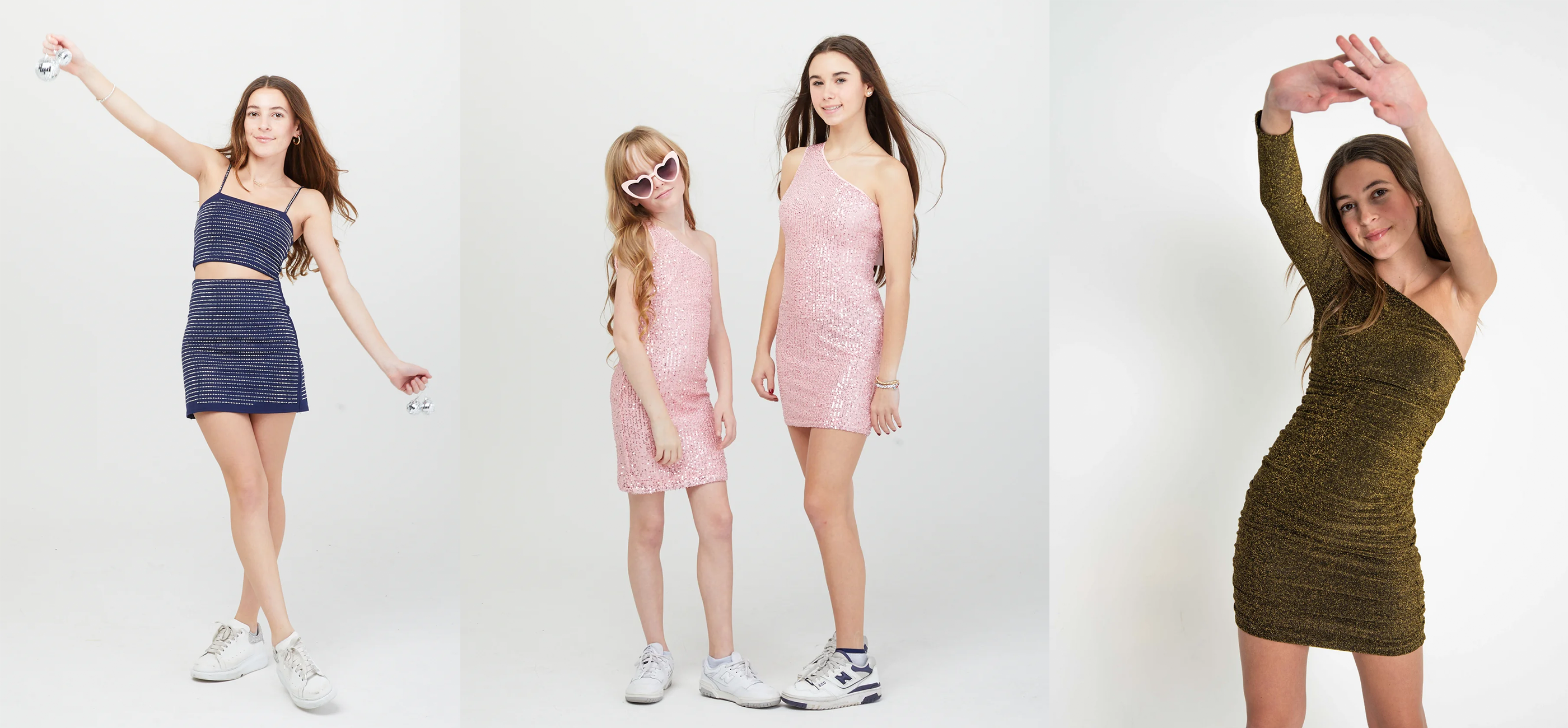 Theme is the brand of choice among middle schoolers hitting the dance-circuit for the first time. The streamlined form-fitting shapes appeal to girls experimenting with their fashion choices. Designed by teen Ariella Maizner who knows what the demographic craves, the dresses can be worn a variety of ways and have removable straps for added comfort and customization.